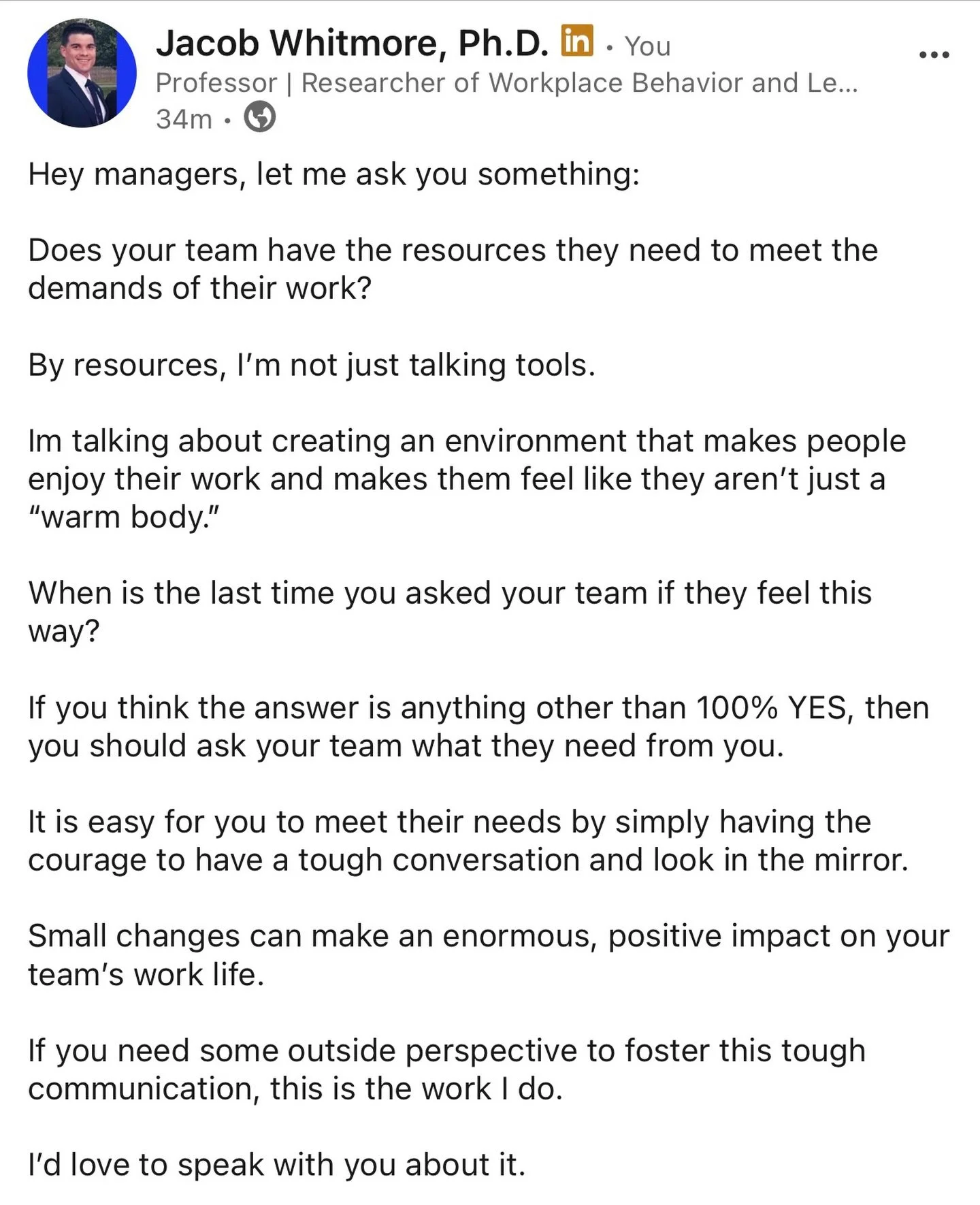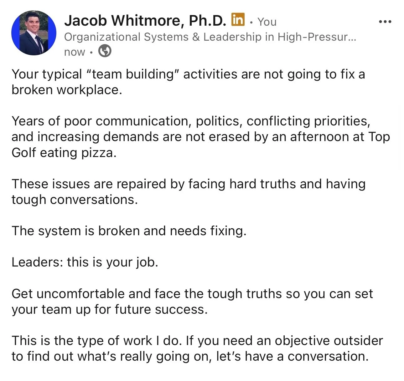 Iโm Dr. Jacob Whitmore. Iโm a business professor, former Army officer, and corporate consultant. I work with leaders when things arenโt working the way they should, and managing around the problem has started to get expensive. My focus is helping leaders see how their systems actually produce behavior, fix whatโs driving the problem, and move forward without overcomplicating it.